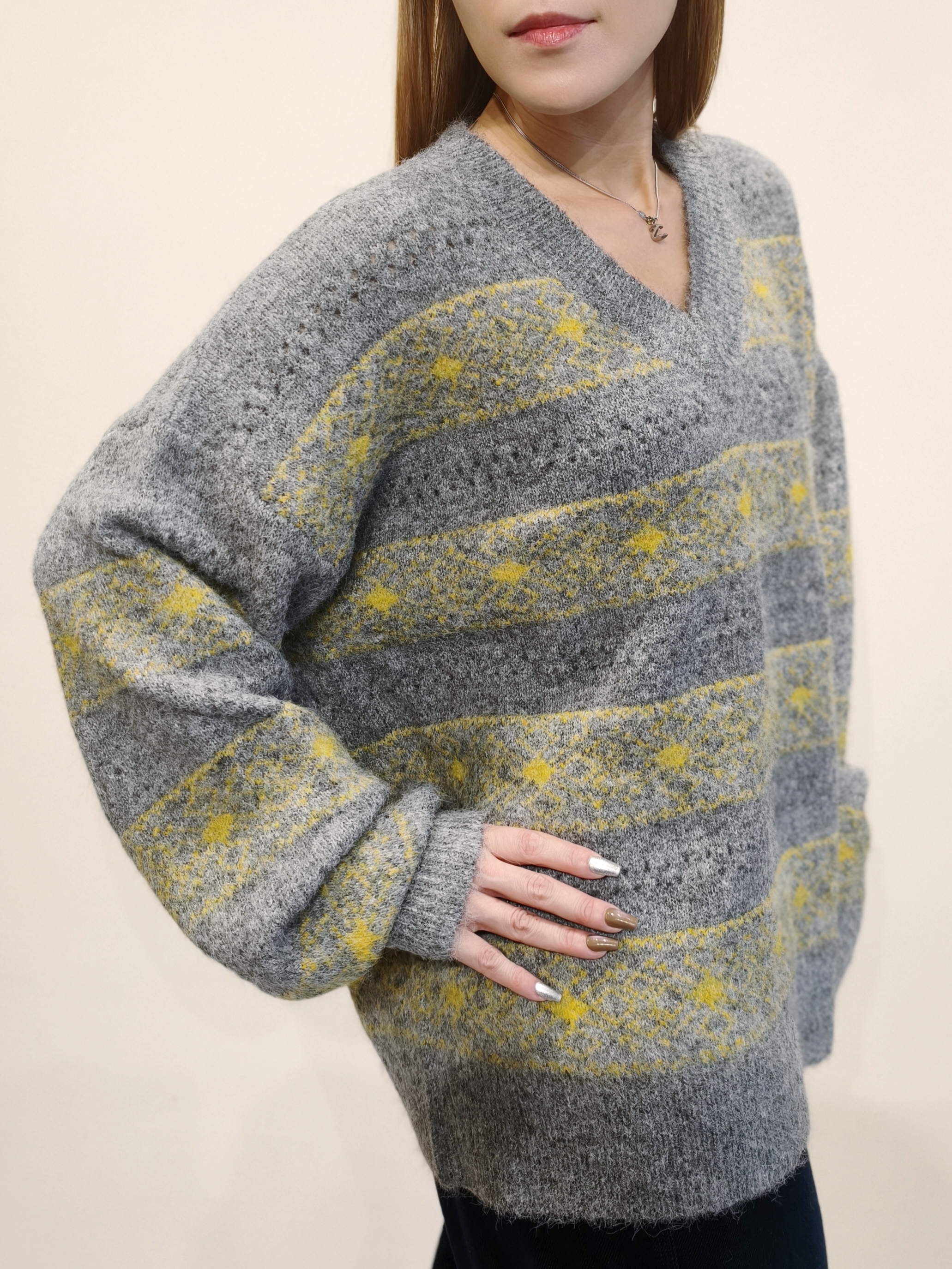 灰色V領織花毛衣